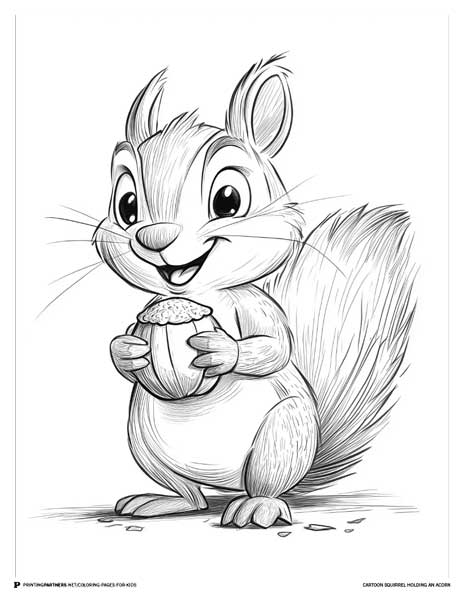 A cute cartoon squirrel holding an acorn, perfect for adding some woodland fun to Thanksgiving coloring.