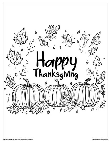 A traditional 'Happy Thanksgiving' design, perfect for kids to celebrate and color in the holiday spirit.