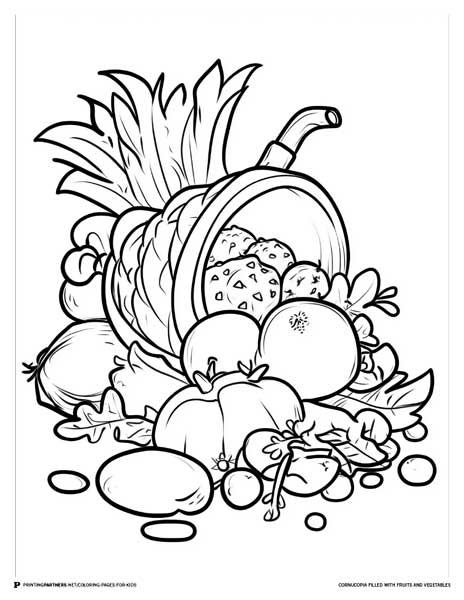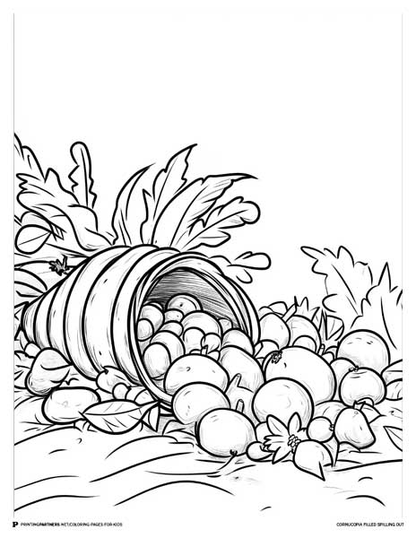 A cornucopia brimming with fruits and vegetables, celebrating the fall harvest and Thanksgiving traditions.