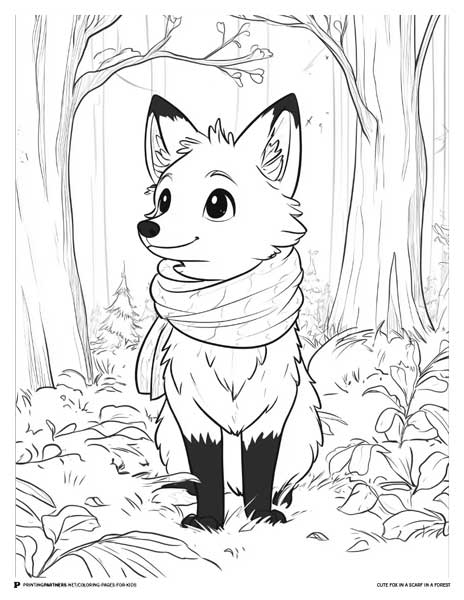 A cozy fox wearing a scarf in a forest, a charming autumn scene perfect for kids to color.