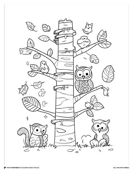 A large tree surrounded by fall animals, a delightful coloring page for children who enjoy nature and the autumn season.