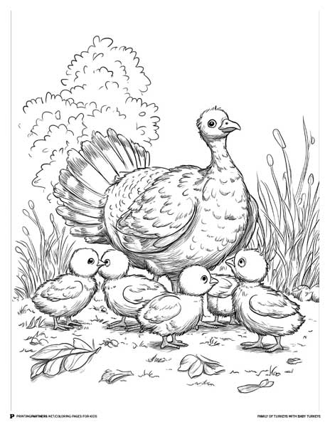 A family of turkeys with cute baby turkeys, a sweet Thanksgiving-themed coloring page for animal lovers.