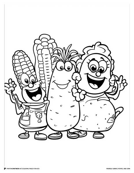 Friendly vegetables—a carrot, potato, and corn—adding some playful fun to Thanksgiving-themed coloring.