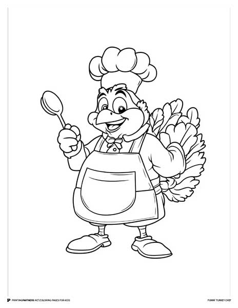 A humorous turkey dressed as a chef, perfect for a light-hearted Thanksgiving coloring activity.
