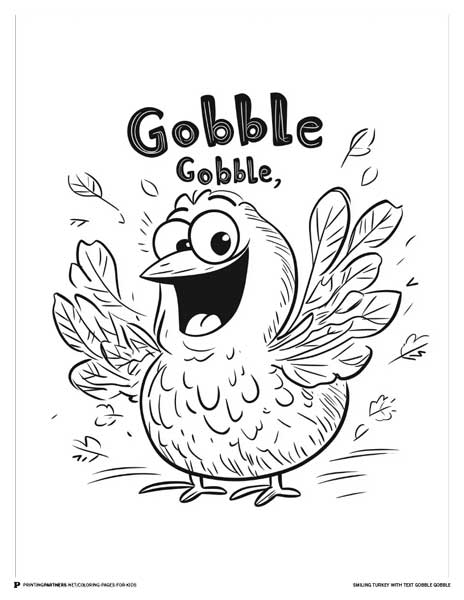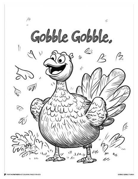 A lively turkey with 'Gobble Gobble' text, capturing the playful spirit of Thanksgiving for kids to enjoy.