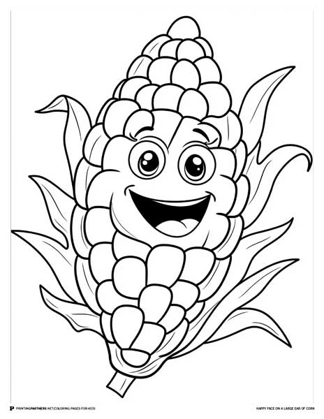 An ear of corn with a happy face, a fun harvest-themed coloring page for young kids.