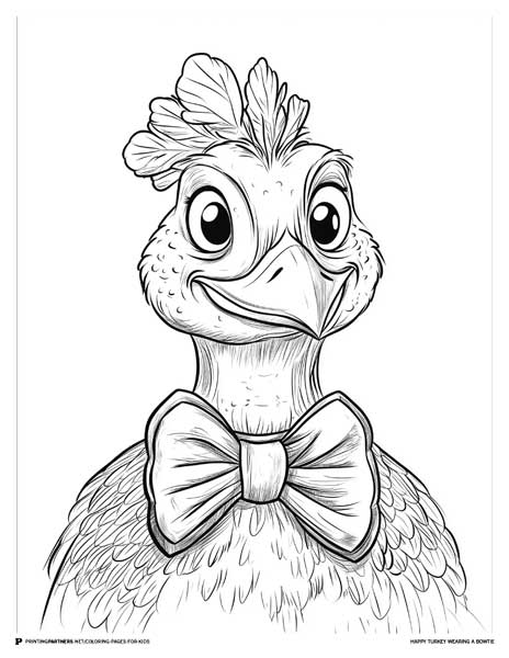 A happy turkey with a bowtie, dressed up and ready for Thanksgiving celebrations. Perfect for festive coloring.