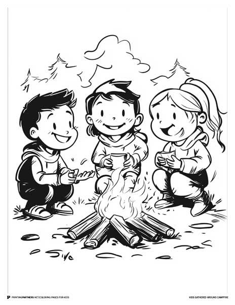 Children gathered around a cozy campfire, enjoying the fall season in a coloring page that celebrates togetherness.