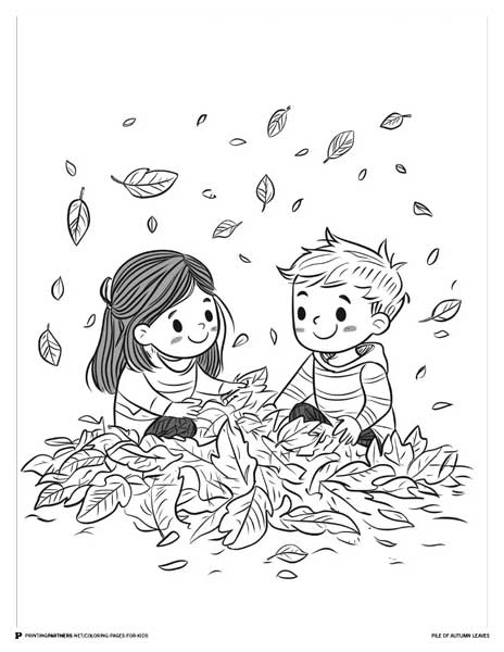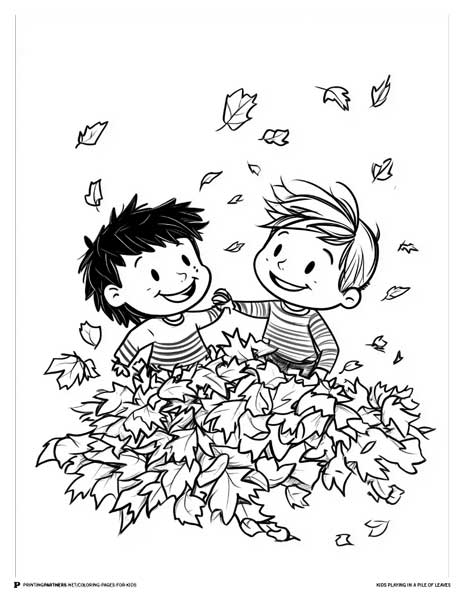 Children having fun in a big pile of autumn leaves, a joyful activity to color that captures the spirit of fall.