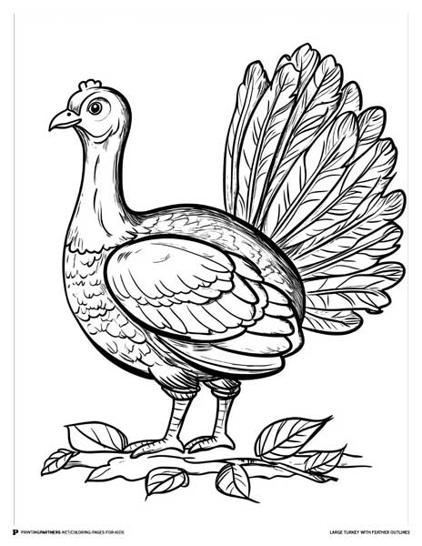 A big turkey with outlined feathers, ideal for kids to decorate with their favorite fall colors.
