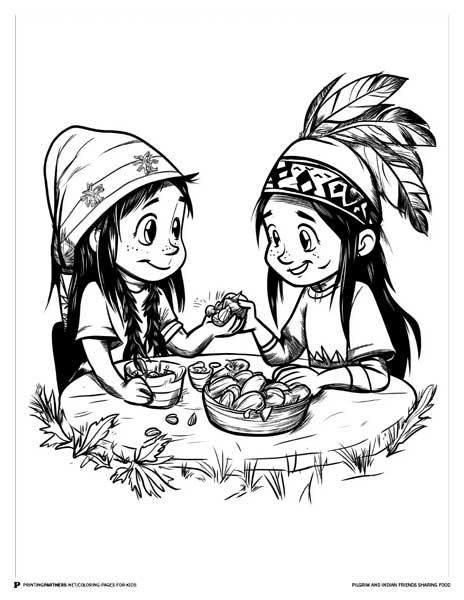 A friendly scene of a Pilgrim and Native American sharing food, celebrating the spirit of Thanksgiving unity.
