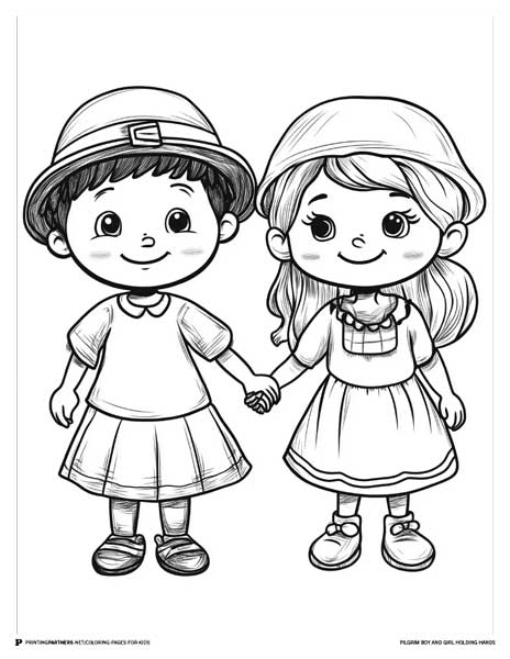 A Pilgrim boy and girl holding hands, a sweet Thanksgiving coloring page to honor tradition and friendship.