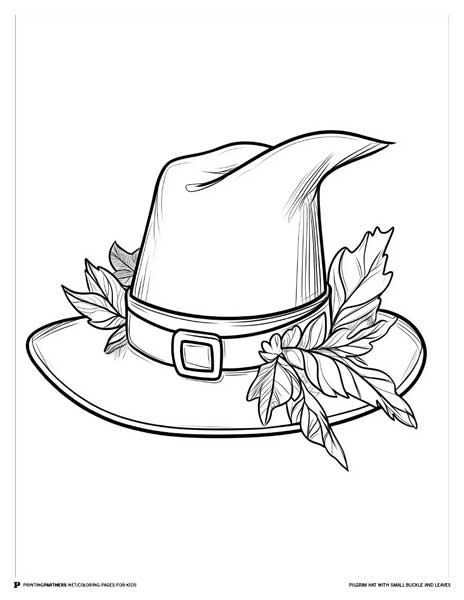 A simple pilgrim hat with a buckle and fall leaves, a classic Thanksgiving symbol for kids to color.