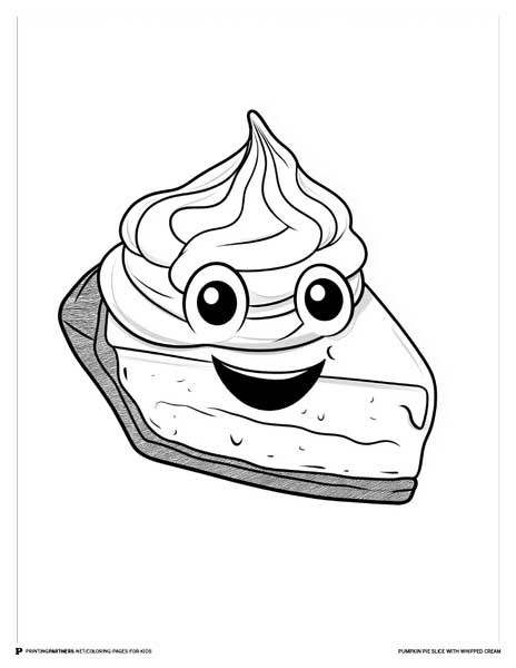 A slice of pumpkin pie topped with whipped cream, a delicious addition to any Thanksgiving-themed coloring collection.