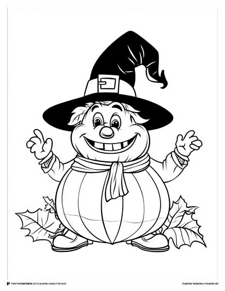 A pumpkin dressed up with a pilgrim hat, bringing together Thanksgiving and Halloween themes in a fun coloring page.