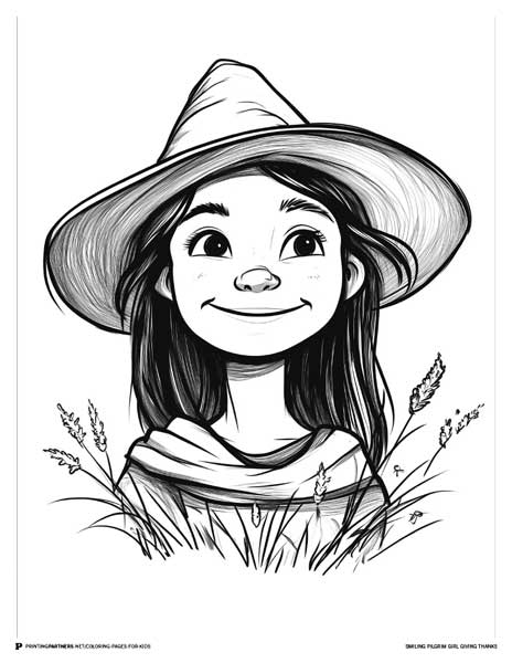 A young pilgrim girl with a thankful smile, a sweet Thanksgiving coloring page celebrating gratitude.