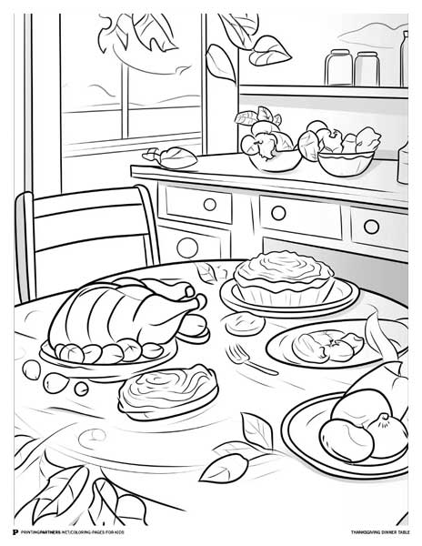 A festive Thanksgiving dinner table loaded with holiday dishes, a coloring page celebrating family gatherings.