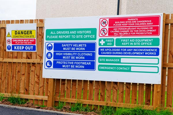 Weather-resistant signage for safety warnings, project details, and contractor information.